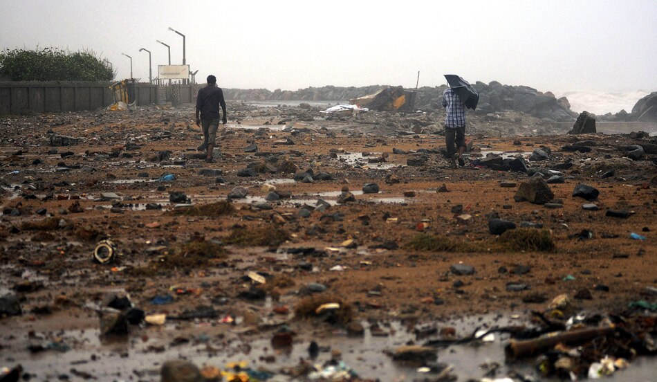 | People walk on a road damaged after being hit by Cyclone Thane, in Chennai, India, Friday, Dec. 30, 2011. The cyclone brought heavy rains and gale-force winds to India's southeastern coast, killing at least 11 people, uprooting trees and damaging homes. (AP Photo/Arun Sankar K.) |