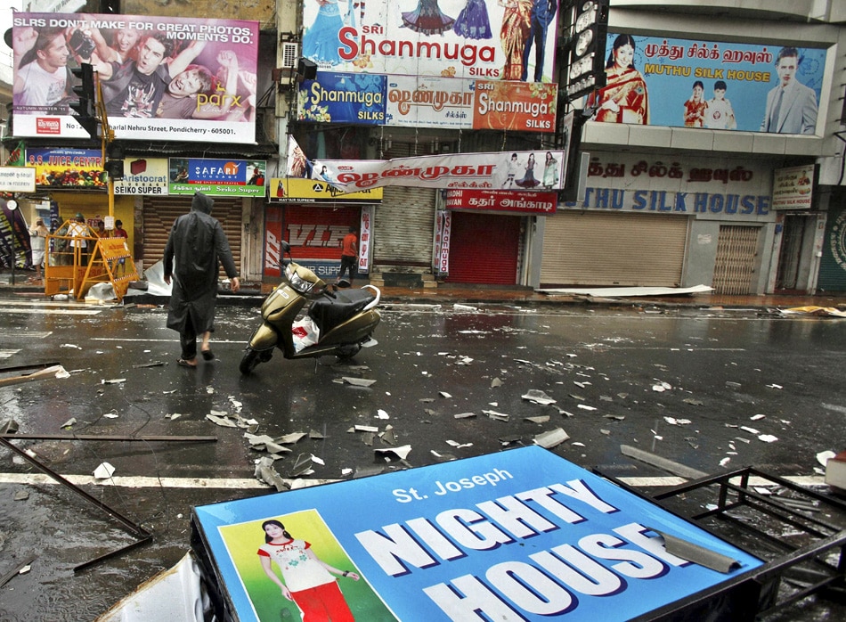 | People walk past fallen sign boards and other trash caused by heavy winds in Pondicherry, India, Friday, Dec. 30, 2011. India's weather office has warned residents along parts of the country's southeastern coast that Cyclone Thane is likely to cause heavy rains and gale-force winds. (AP Photo/Aijaz Rahi) |