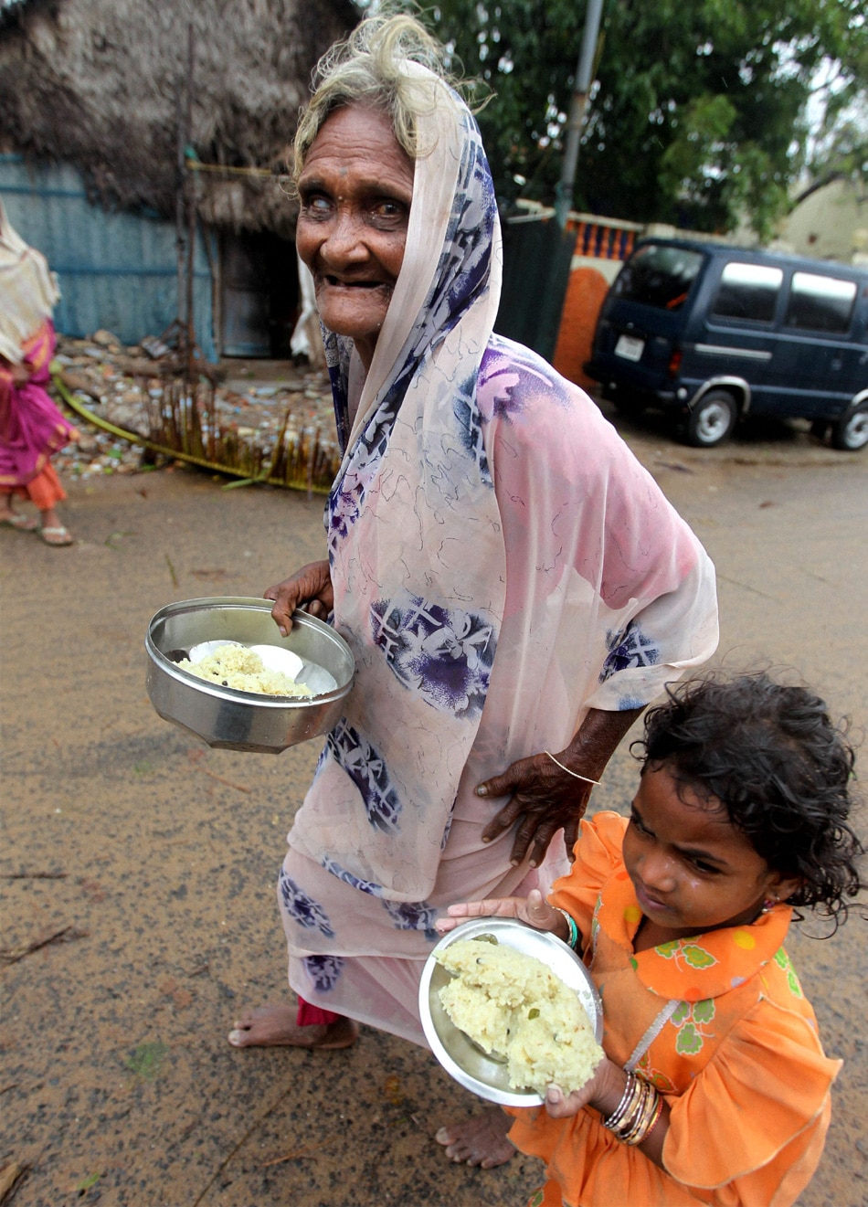 | Chennai: An old lady with a child after collect their food from corporation officials at Pattinapakkam near Marina Beach following Cyclone Thane in Chennai on Friday. The cyclonic storm on Friday morning moved further westward and crossed north Tamil Nadu coast between Cuddalore and Puducherry. PTI Photo by R Senthil |