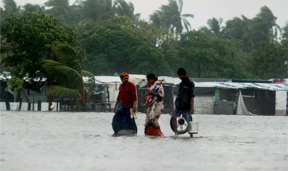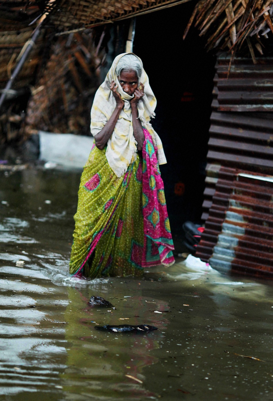 | Chennai: An old lady is seen near her flooded hut at Srinivasapuram near Marina beach in Chennai on Thursday. The coastal districts in the state have been put on high alert in view of Cyclone Thane which is currently near the coast of Chennai and is likely to cross the coast on December 30. PTI Photo by R Senthil Kumar |