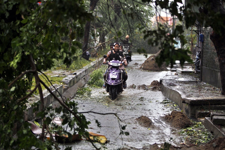 | Motorcyclists drive past fallen trees during heavy rain and winds in Pondicherry, India, Friday, Dec. 30, 2011. India's weather office has warned residents along parts of the country's southeastern coast that Cyclone Thane is likely to cause heavy rains and gale-force winds. (AP Photo/Aijaz Rahi) |