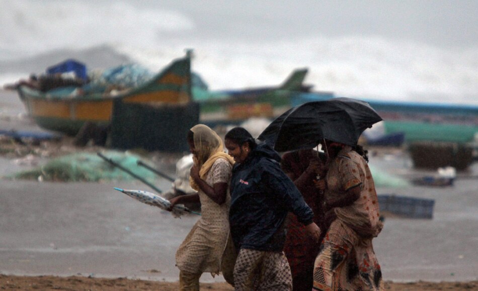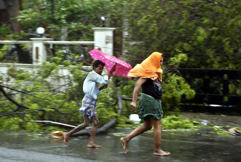 | People run for cover from heavy winds in Pondicherry, India, Friday, Dec. 30, 2011. India's weather office has warned residents along parts of the country's southeastern coast that Cyclone Thane is likely to cause heavy rains and gale-force winds. (AP Photo/Aijaz Rahi) |