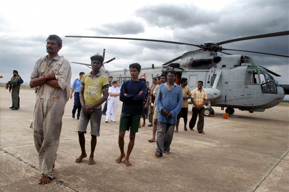 | Visakhapatnam: Fishermen come out of a helicopter after being rescued by the eastern Naval Command in Visakhapatnam on Thursday. Eleven fishermen trapped in the Bay of Bengal near Narasapur in East Godavari district and Yanam of Pondicherry due to severe cyclone 'Thane'. PTI Photo |