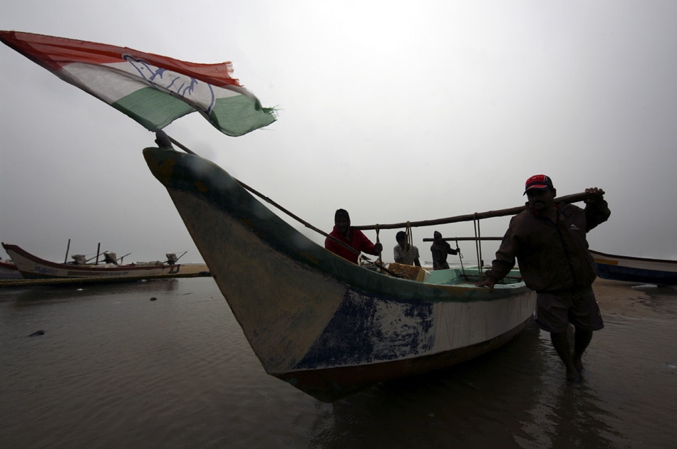 | Indian fisherman move their boat to safer places as water levels rise on the beach on the Bay of Bengal coast in Chennai, India, Thursday, Dec. 29, 2011. Tropical Cyclone Thane, located in the Bay of Bengal, is forecast to make landfall on the southern coast of India, south of Chennai near Puducherry, early Friday morning. The cyclone is expected to bring heavy rains, strong winds and dangerous waves to the region as it approaches.(AP Photo/Arun Sankar.K) |