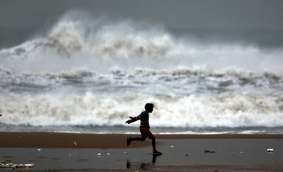 | Chennai: A boy plays at Marina beach as high rising waves are seen in the sea, in Chennai on Thursday. The coastal districts in the state have been put on high alert in view of Cyclone Thane which is currently near the coast of Chennai and is likely to cross the coast on December 30. PTI Photo by R Senthil Kumar |