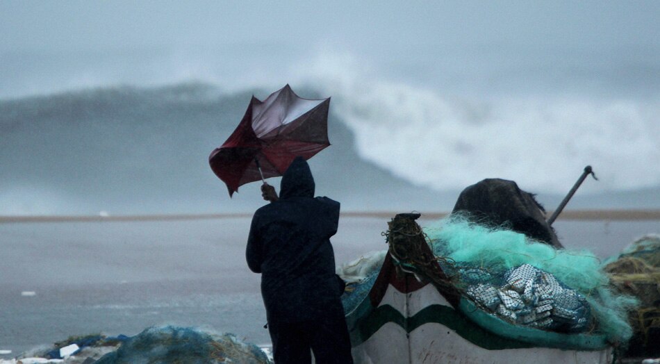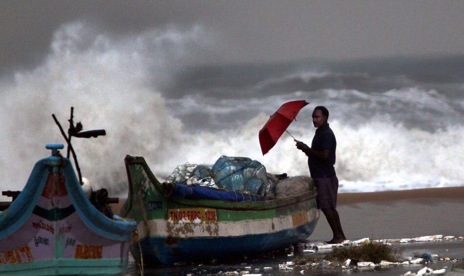 | Chennai: A fisherman watches a high rising wave from Marina beach in Chennai on Thursday. The coastal districts in the state have been put on high alert in view of Cyclone Thane which is currently near the coast of Chennai and is likely to cross the coast on December 30. PTI Photo by R Senthil Kumar |