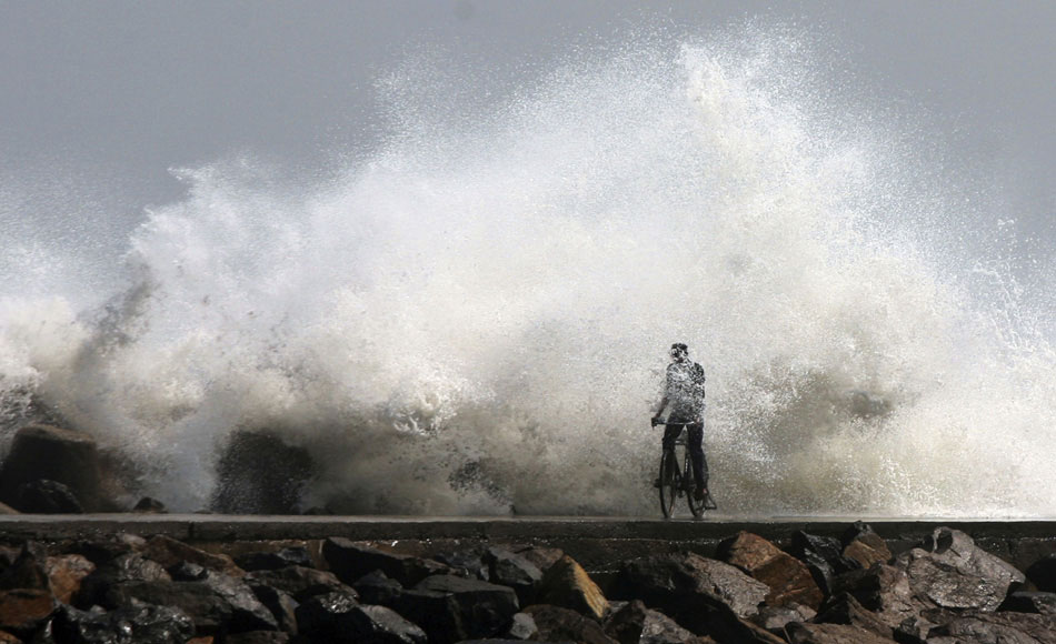 | A cyclist makes his way past waves breaking on the Bay of Bengal coast in Chennai, India, Wednesday, Dec. 28, 2011. Tropical Cyclone Thane will continue to move westward toward southern India. The storm is forecast to make landfall early Friday near the Chennai region. (AP Photo) |