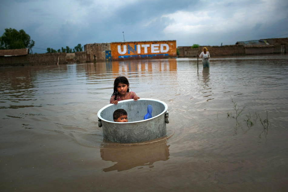 MUZAFFARGARH, PAKISTAN - AUGUST 11: Villagers displaced from their homes by flooding sit on their belongings as they are evacuated on August 11, 2010 on the outskirts of Muzaffargarh in Punjab, Pakistan. An estimated 14 million Pakistanis affected by the worst floods in the country's history are bracing for more destruction as monsoon rains further bloat rivers and streams. The rivers Indus and the Chenab are in danger of having their levies broken, which will cause catastrophic flooding across Punjab and Sindh provinces. Deadly flooding across Pakistan has claimed the lives of more than 1,200 people and has forced hundreds of thousands from their homes. (Photo by Daniel Berehulak/Getty Images) |